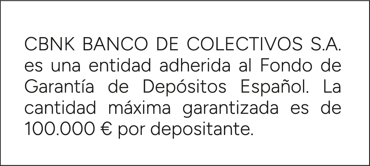 CBNK Banco de Colectivos, S.A está adherido al Código de Buenas Prácticas recogido en el Real Decreto-ley 6/2012, de 9 de marzo, de medidas urgentes de protección de deudores hipotecarios sin recursos.